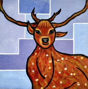 Vrolijk schilderij van een moederhert met jong, samen in een rustige ongestoorde omgeving. Grafische stijl in felle kleuren.