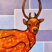 Vrolijk schilderij van een moederhert met jong, samen in een ongestoorde omgeving. Grafische stijl in felle kleuren.
